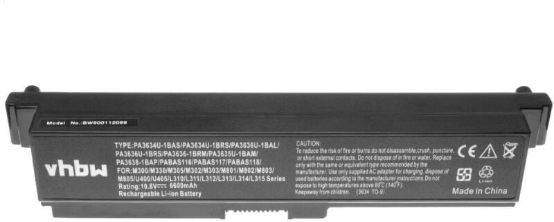 VHBW Notebook akkumulátor Toshiba PA3635U-1BAM, PA3634U-1BAS - 6600 mAh 10, 8 V Li-Ion, fekete (800112089)
